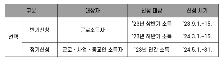 근로소득만 있는 자는 반기신청과 정기신청을 선택하여 신청할 수 있고,