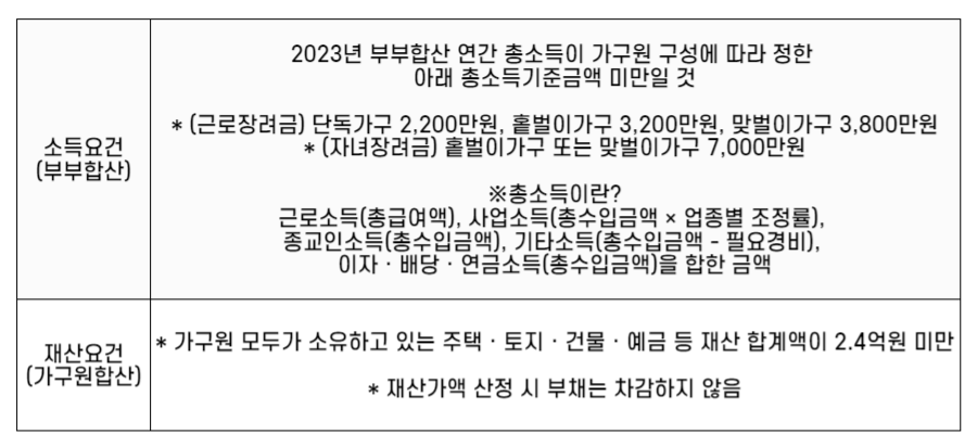 *소득,재산요건: 2022년 부부합산 총소득이 기준금액 미만이고, 2022.06.01 기준 가구원 모두의 재산합게액이 2.4억원 미만